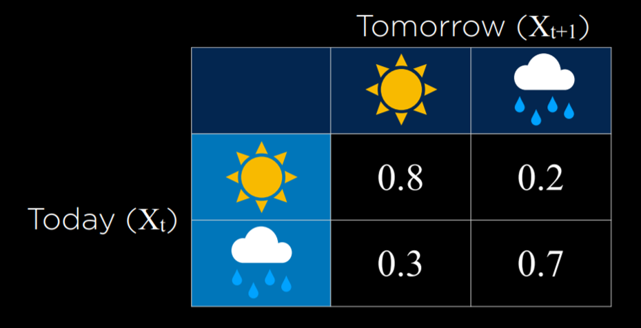 $。为了便于解释,这些值有一个固定的顺序(在我们的情况下,准时、延迟、取消)。 ### 独立性(Independence) - 独立性是指一个事件的发生不会影响另一个事件发生的概率。例如,当掷两个骰子时,每个骰子的结果与另一个骰子的结果是独立的。用第一个骰子掷出 4 不会影响我们掷出的第二个骰子的值。这与依赖事件相反,比如早上的云和下午的雨。如果早上多云,下午更有可能下雨,所以这些事件是有依赖性的。 - 独立性可以用数学定义:事件$a$和$b$是独立的,当且仅当$a$并且$b$的概率等于$a$的概率乘以$b$的概率:$P(a∧b)=P(a)P(b)$。 ## 贝叶斯规则(Bayes’ Rule) - 贝叶斯规则在概率论中常用来计算条件概率。换句话说,贝叶斯规则说,给定$b$条件下$a$的概率等于给定$a$的条件下$b$概率,乘以$b$的概率除以$a$ 的概率。 - $P(b|a)=\frac{P(a|b)P(b)}{P(a)}$ - 例如,如果早上有云,我们想计算下午下雨的概率,或者$P(雨|云)$。我们从以下信息开始: - 80% 的雨天下午开始于多云的早晨,或$P(云|雨)$。 - 40% 的日子早晨多云,或$P(云)$。 - 10% 的日子有下雨的下午,或$P(雨)$。 - 应用贝叶斯规则,我们计算$\frac{0.8*0.1}{0.4}=0.2$。也就是说,考虑到早上多云,下午下雨的可能性是 20%。 - 除了$P(a)$和$P(b)$之外,知道$P(a|b)$还允许我们计算$P(b|a)$。这是有帮助的,因为知道给定未知原因的可见效应的条件概率$P(可见效应|未知原因)$,可以让我们计算给定可见效应的未知原因的概率$P(未知原因|可见效应)$。例如,我们可以通过医学试验来学习$P(医学测试结果|疾病)$,在医学试验中,我们对患有该疾病的人进行测试,并观察测试结果发生的频率。知道了这一点,我们就可以计算出$P(疾病|医学检测结果)$,这是有价值的诊断信息。 ## 联合概率(Joint Probability) - 联合概率是指多个事件全部发生的可能性。 - 让我们考虑下面的例子,关于早上有云,下午有雨的概率。 | C=云 | C=$\lnot$云 | | ---- | ----------- | | 0.4 | 0.6 | | R=雨 | R=$\lnot$雨 | | ---- | ----------- | | 0.1 | 0.9 | - 从这些数据来看,我们无法判断早上的云是否与下午下雨的可能性有关。为了做到这一点,我们需要看看这两个变量所有可能结果的联合概率。我们可以将其表示在下表中: | | R=雨 | R=$\lnot$ 雨 | | ----------- | ---- | ------------ | | C=云 | 0.08 | 0.32 | | C=$\lnot$云 | 0.02 | 0.58 | - 现在我们可以知道有关这些事件同时发生的信息了。例如,我们知道某一天早上有云,下午有雨的概率是 0.08。早上没有云,下午没有雨的概率是 0.58。 - 使用联合概率,我们可以推导出条件概率。例如,如果我们感兴趣的是在下午下雨的情况下,早上云层的概率分布。$P(C|雨)=\frac{P(C,雨)}{P(雨)}$旁注:在概率上,逗号和$∧$可以互换使用。因此,$P(C,雨)=P(C\land 雨)$。换句话说,我们将降雨和云层的联合概率除以降雨的概率。 - 在最后一个方程中,可以将$P(雨)$视为$P(C,雨)$乘以的某个常数$\alpha=\frac{1}{P(雨)}$。因此,我们可以重写$P(C|雨)=\frac{P(C,雨)}{P(雨)}=αP(C,雨)$,或$α<0.08,0.02>=<0.8,0.2>$。考虑到下午有雨,将$α$分解后,我们可以得到 C 的可能值的概率比例。也就是说,如果下午有雨,那么早上有云和早上没有云的概率的比例是$0.08:0.02$。请注意,0.08 和 0.02 的总和不等于 1;然而,由于这是随机变量 C 的概率分布,我们知道它们应该加起来为 1。因此,我们需要通过算$α$来归一化这些值,使得$α0.08+α0.02=1$。最后,我们可以说$P(C|雨)=<0.8,0.2>$。 ## 概率规则(Probability Rules) - 否定(Negation): $P(\lnot a)=1-P(a)$。这源于这样一个事实,即所有可能世界的概率之和为 1,互补事件$\lnot a$和 $a$ 包括所有可能世界。 - 包含-排除 Inclusion-Exclusion:$P(a\lor b)=P(a)+P(b)-P(a\land b)$。这可以用以下方式解释:$a$或$b$为真的世界等于$a$为真的所有世界,加上$b$为真的所有世界。然而,在这种情况下,有些世界被计算两次(a和$b$都为真的世界)。为了消除这种重叠,我们将$a$和$b$ 都为真的世界减去一次(因为它们被计算了两次)。 > 下面是一个例子,可以说明这一点。假设我 80% 的时间吃冰淇淋,70% 的时间吃饼干。如果我们计算今天我吃冰淇淋或饼干的概率,不减去$P(冰淇淋∧饼干)$,我们错误地得出 0.7+0.8=1.5。这与概率在 0 和 1 之间的公理相矛盾。为了纠正我同时吃冰淇淋和饼干的天数计算两次的错误,我们需要减去$P(冰淇淋∧饼干)$一次。 - 边缘化(Marginalization):$P(a)=P(a,b)+P(a,\lnot b)$。这里的观点是,$b$和$\lnot b$是独立的概率。也就是说,$b$和$\lnot b$同时发生的概率为0。我们也知道$b$和$\lnot b$的总和为1。因此,当$a$发生时,$b$可以发生也可以不发生。当我们把$a$和$b$发生的概率加上$a$和$\lnot b$的概率时,我们得到的只是$a$ 的概率。 - 随机变量的边缘化可以用:$P(X=x_i)=\sum_jP(X=x_i,Y=y_j)$表示 - 方程的左侧表示“随机变量$X$具有$x_i$值的概率” 例如,对于我们前面提到的变量C,两个可能的值是早上有云和早上没有云。等式的正确部分是边缘化的概念。$P(X=x_i)$等于$x_i$以及随机变量$Y$的每一个值的所有联合概率之和。例如,$P(C=云)=P(C=云,R=雨)+P(C=云,R=\lnot 雨)=0.08+0.32=0.4$。 - 条件边缘化: $P(a)=P(a|b)P(b)+P(a|\lnot b)P(\lnot b)$。这是一个类似于边缘化的想法。事件$a$发生的概率等于给定$b$的概率乘以$b$的概率,再加上给定$\lnot b$的概率乘以$\lnot b$ 的概率。 - $P(X=x_i)=\sum_jP(X=x_i|Y=y_i)P(Y=y_i)$ - 在这个公式中,随机变量$X$取$x_i$值概率等于$x_i$以及随机变量$Y$的每个值的联合概率乘