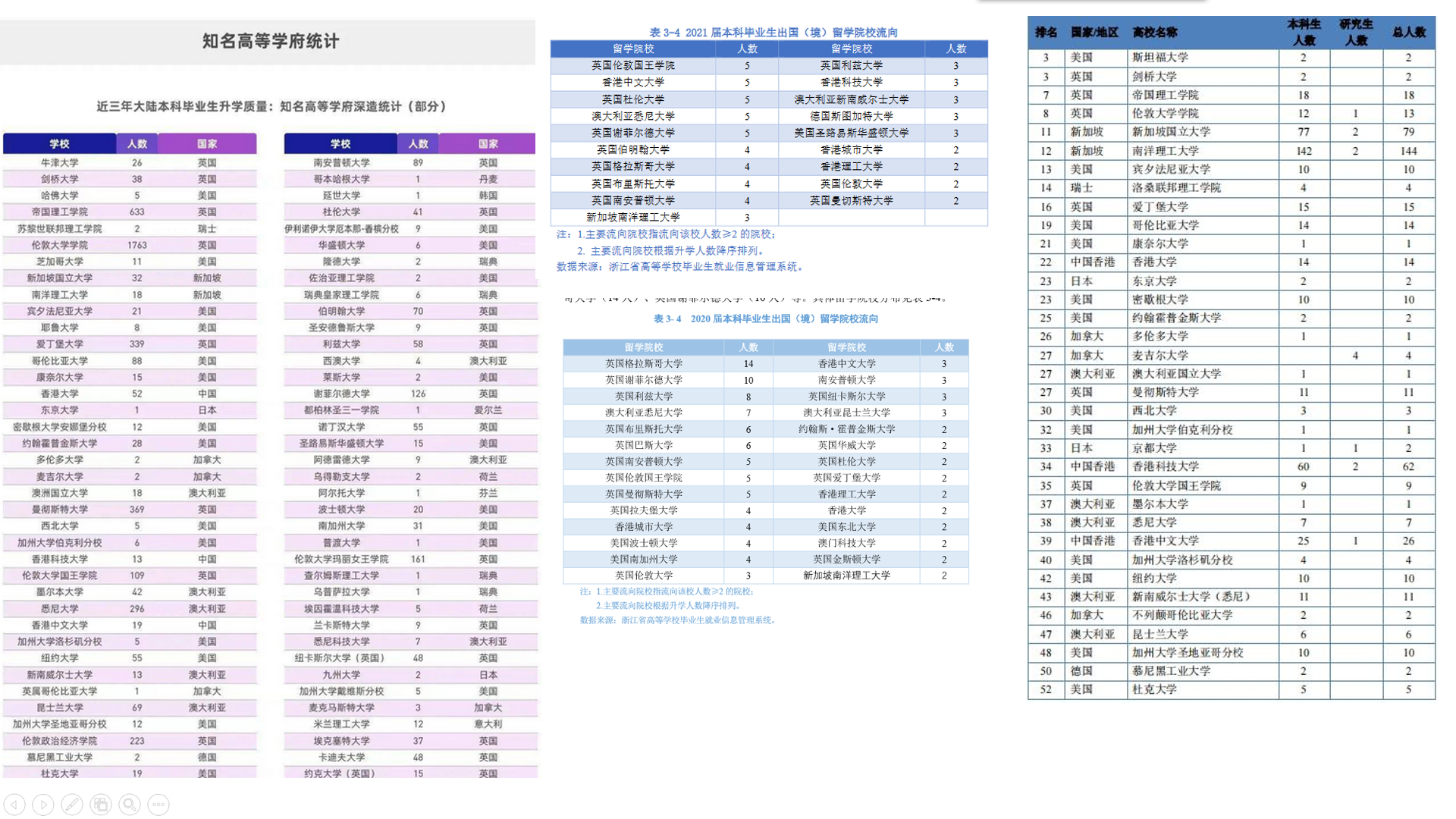 点开图片可以看到左边是西交利物浦的出国数据,中间是杭电的数据,右边是成都电子科技大学的数据,可以看出西交利物浦每年去名校的数量大概是杭电一年的 20-40 倍,成电是杭电的一年的 10 倍左右,杭电出国数据实际上只有寥寥几个名校,剩下的则是一些英国院校。