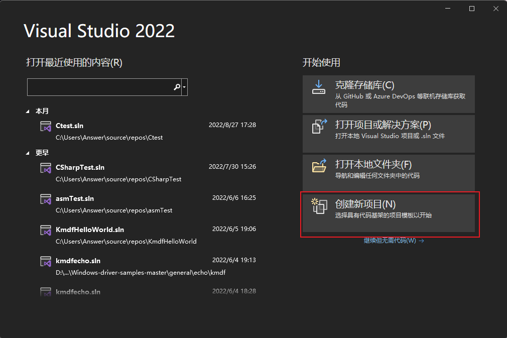 打开 VS会打开如下界面我使用深色主题在此处单击“创建新项目”