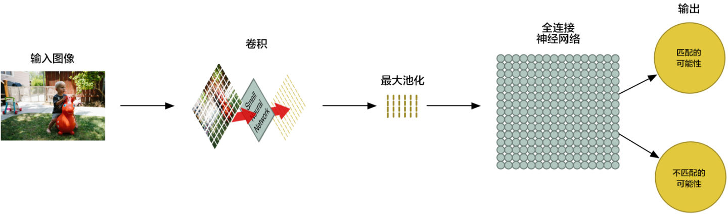 你猜怎么着?数组就是一串数字而已,所以我们我们可以把这个数组输入到另外一个神经网络里面去。最后的这个神经网络会决定这个图片是否匹配。为了区分它和卷积的不同,我们把它称作「全连接」网络
