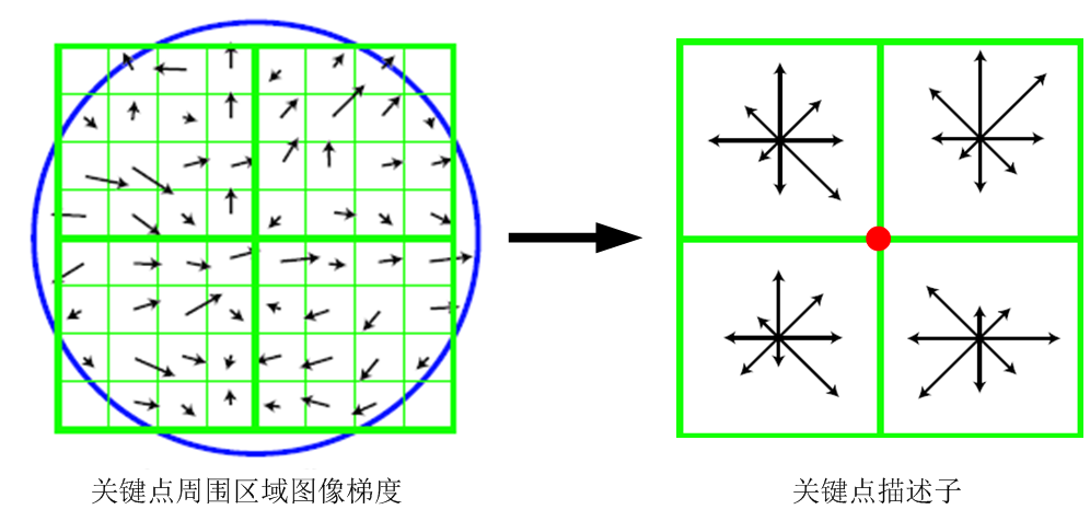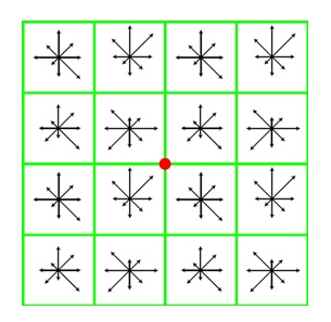 操作可以优化为下图,先把关键点周围的像素分成 4 块,每块求一次上面的操作,以这个 4 个梯度直方图作为关键点的方向描述。也就是一个 228(方向数量)的矩阵作为这个点的方向特征。