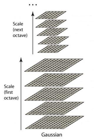 首先是高斯金字塔,它是把原图先放大两倍,然后使用高斯滤波(高斯卷积)对图像进行模糊化数次,取出倒数第三层缩小一半继续进行这个过程,也就是说它是由一组一组的小金字塔组成的。