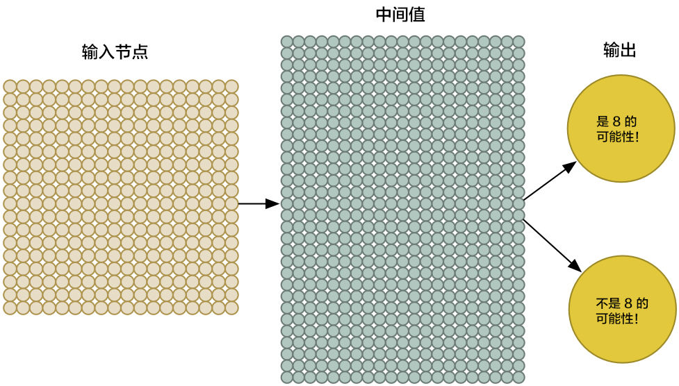请注意,我们的神经网络现在有了两个输出(而不仅仅是一个房子的价格)。第一个输出会预测图片是「8」的概率,而第二个则输出不是「8」的概率。概括地说,我们就可以依靠多种不同的输出,利用神经网络把要识别的物品进行分组。
