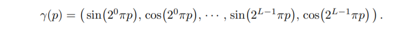 学过 cv 的大家想必对这个东西耳熟能详了吧~,这里的位置编码是对输入的两个位置和一个方向进行的(体素位置,相机位置和方向),使用的是类似 transformer 的三角函数类编码如下。位置编码存在的意义是放大原本的 5 维输入对网络的影响程度,把原本的 5D 输入变为 90 维向量;并且加入了与其他体素的相对位置信息。