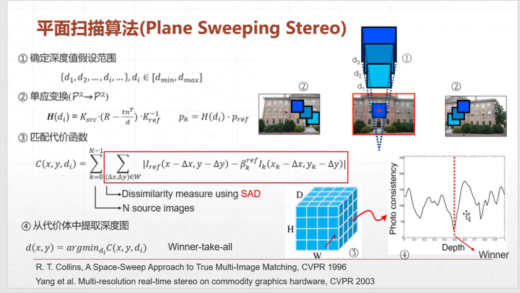 平面扫描就是把 A 视角中的某一像素点(如图中红色区域)的相邻的几个像素提取出来,用单应性变换转换到 B 视角中,这时候用的深度是假设的深度,遍历所有假设的深度,计算通过每一个假设深度经过单应性变换得到的像素小块和 B 视角中对应位置的差值(loss),取最小的 loss 处的深度作为该像素的深度。