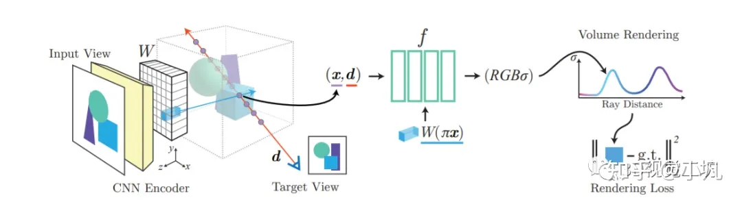 这里作者对 nerf 进行了修改,让 nerf 通过 latent code 渲染图片。流程是先用 latent code 构建三维网格,在这个网络中用空间插值得到具体某个点的值。这一步通过 3D 卷积实现,把原先存在空间中的离散的点整合到一个 latent code volume 中,在这个空间中进行 nerf 的渲染。省掉了 mlp,把整个建模储存在 3D 网格中而非 MLP 中,加快计算速度。