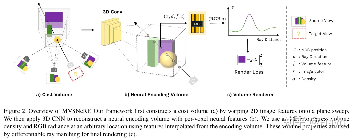 MVSnerf 它用 MVS 的方法构建代价体然后在后面接了一个 nerf,MVS 是使用多视角立体匹配构建一个代价体,用 3D 卷积网络进行优化,这里对代价体进行 nerf 采样,可以得到可泛化网络。它需要 15min 的微调才能在新数据上使用。多视角立体匹配是一种传统算法,通过光线,几何等信息计算图像中小块的相似度,得出两个相机视角之间的位置关系。这个算法也被广泛使用在得到我们自己采样的数据的相机变换矩阵上(我就是这么干的)