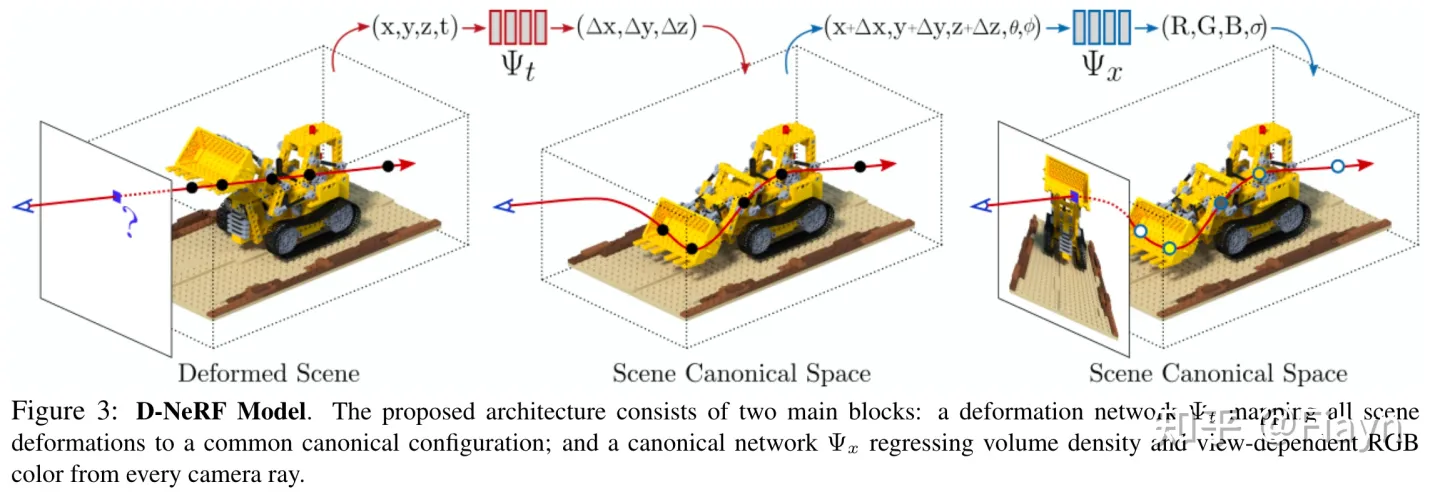 把整个网络分为两块,一块是正常的 nerf 渲染,另一块是下面这个,输入时间与现在的位置坐标,输出这个位置坐标中的物体现在的位置与 t=0 时的位置的差。再用 t=0 时物体的点信息进行渲染。